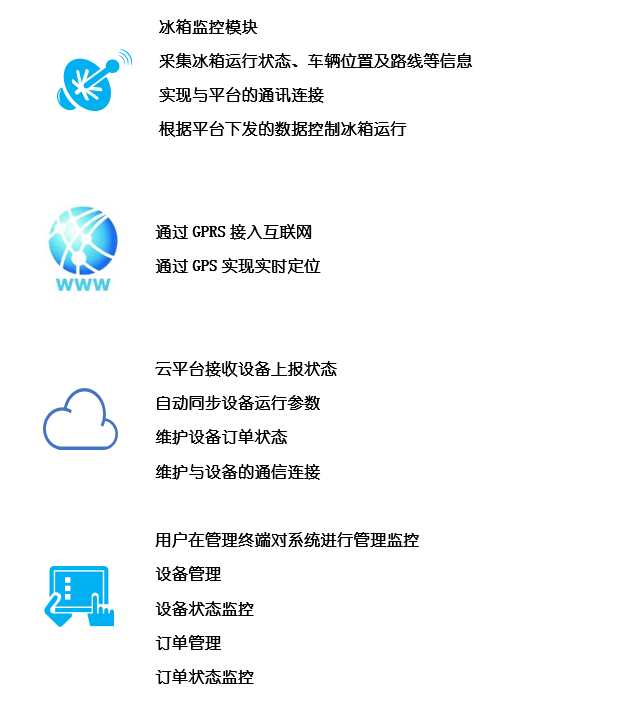 设备周期上报温度、湿度、电量,以及各种工作状态的数据,IOT核心板接收以后进行数据分析,并上报数据和当前GPS信息,用户可以随时查看,若发现冰箱状态异常系统将即时上报。